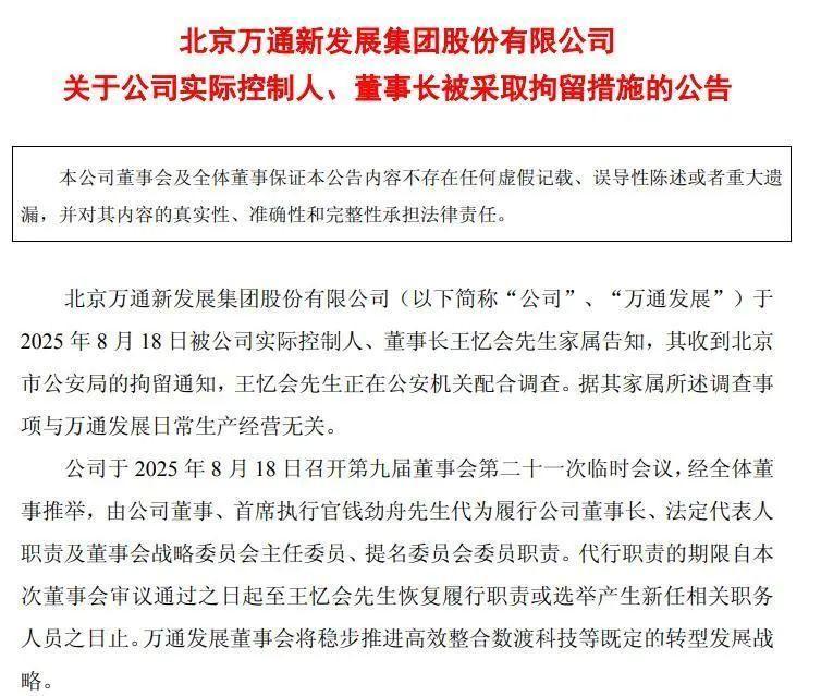 2025年8月18日晚,公司发布公告称,公司实际控制人、董事长王忆会的家属,收到北京市公安局的拘留通知,王忆会先生正在公安机关配合调查。